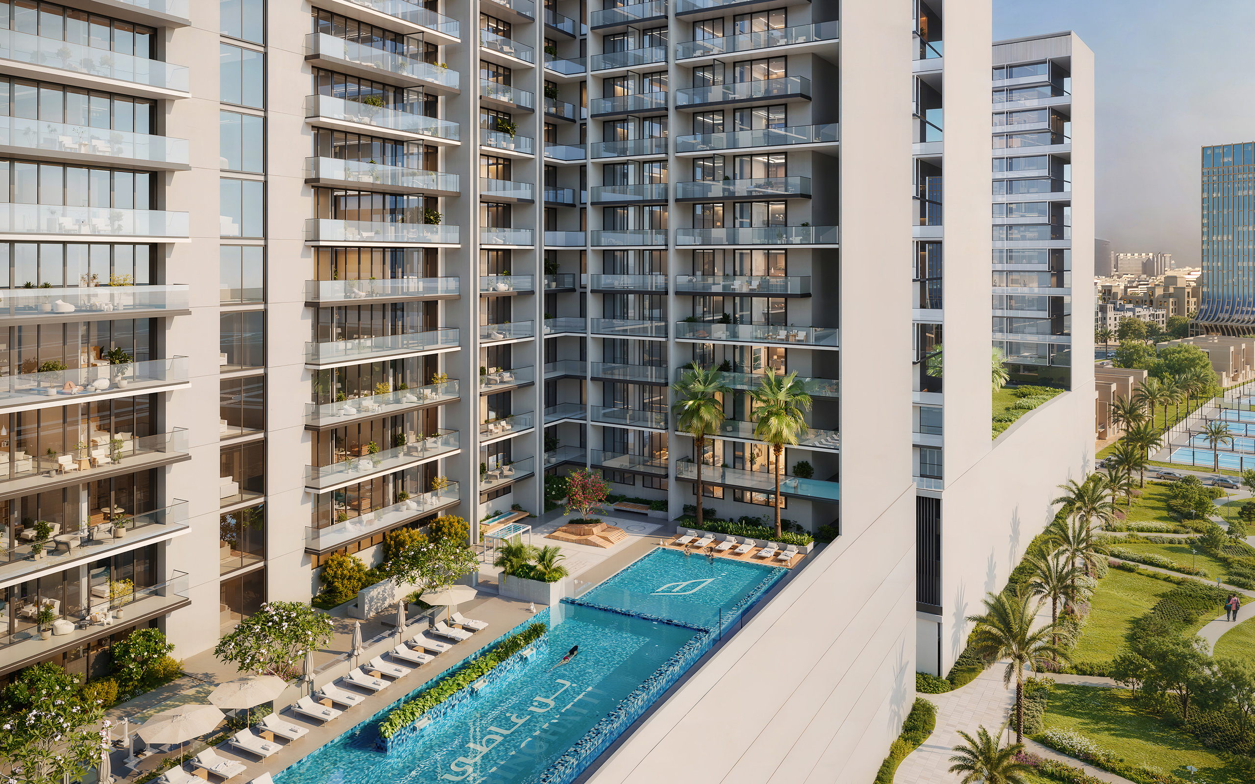 A dedicated office suite and 10 ground-floor retail shops animate the street level. Inside, 572 units offer studios, one-, two-, and three-bedroom apartments with expansive layouts and floor-to-ceiling windows.